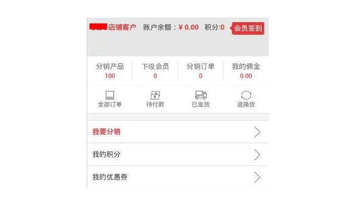 分销审核通过或管理设置成为分销商,分销商会员主页相比会员主页,会显示分销产品(分销商品)、下线会员、分销订单、我的佣金、我要分销(分销专题)